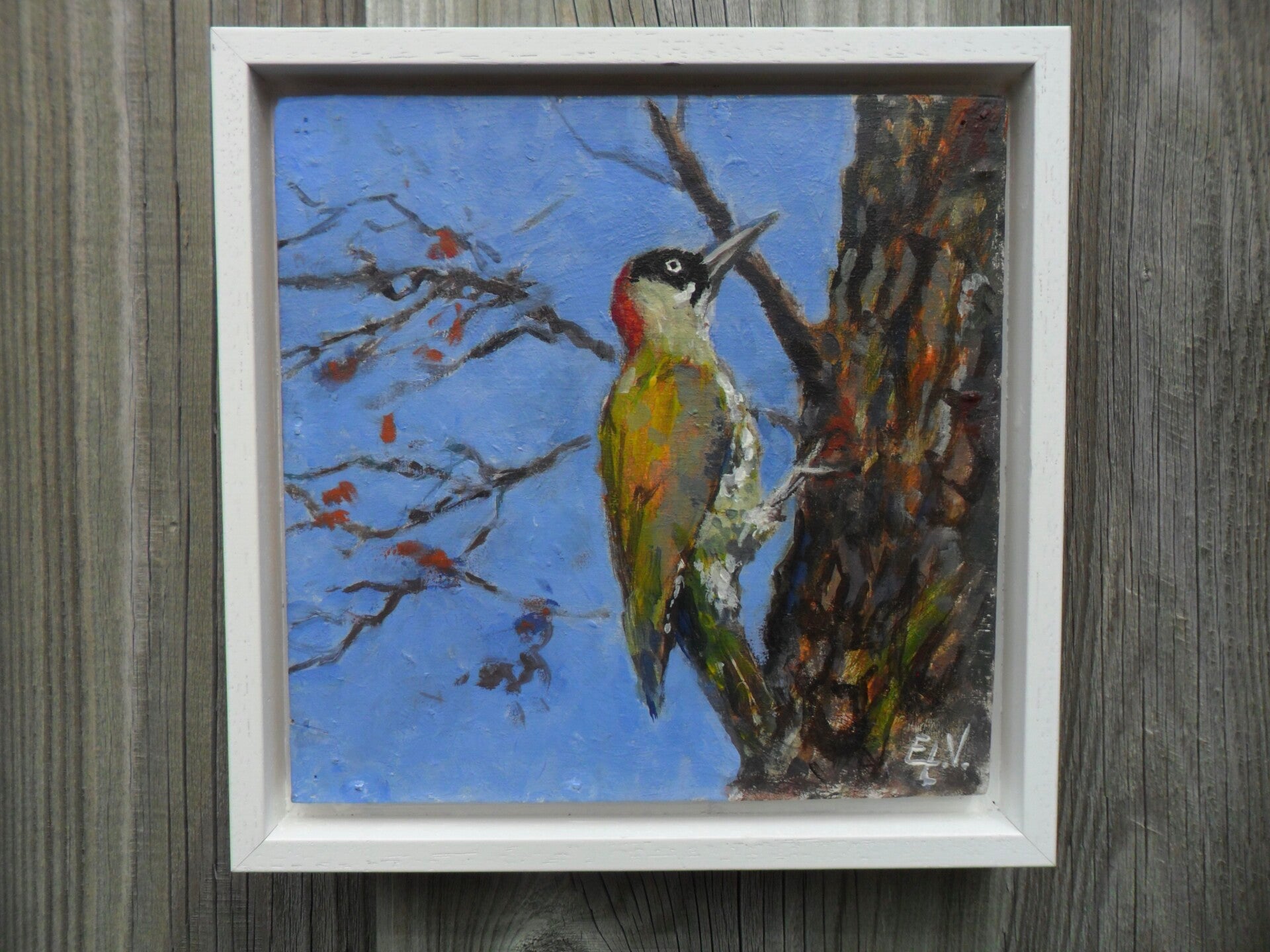 Groene specht tegen boomstam. Bestelnr. 2613